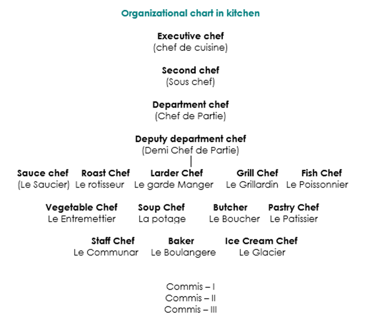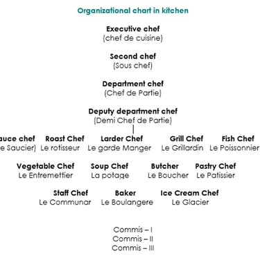 An organizational chart for a hotel kitchen department can vary depending on the size of the hotel, the number of restaurants, and the hotel's overall structure. However, here is an example of a typical organizational chart for a hotel kitchen department: