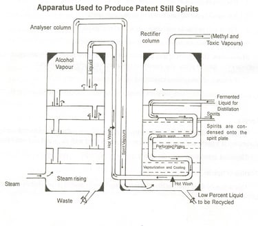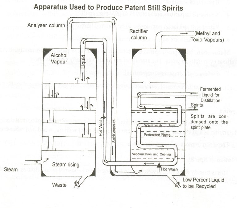 The patent still consists of 2 columns each about 18 meters high. One column is called the analyzer, whose role is to separate the constituent parts. The other column is rectifier which raises the strength of spirit and also purifies it and condenses the alcoholic vapors. Each column is sub-divided horizontally into chambers by perforated copper plates which have a drip pipe leading to the chamber underneath. Both columns are preheated by steam and the fermented liquid or wash enters at the top of the rectifier and gradually descends through it inside a pipe.