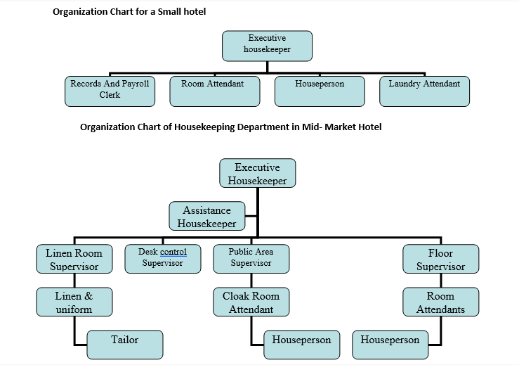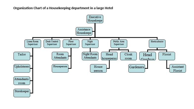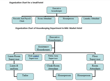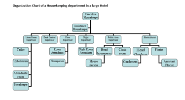 Organization is the process of identifying and grouping the work to be performed, defining and delegating responsibility and authority, and establishing relationships to enable people to work more effectively in accomplishing objectives. If the whole establishment has to work as in unit, there must be clear lines of authority and good lines of communication. The organizational structure of a housekeeping department –whether in a small, medium, or large hotel is depicted using an organization chart. “An organization chart is a schematic representation of the relationships between positions within an establishment showing where each position fits into overall organization and illustrating the division of responsibility and lines of authority”.
